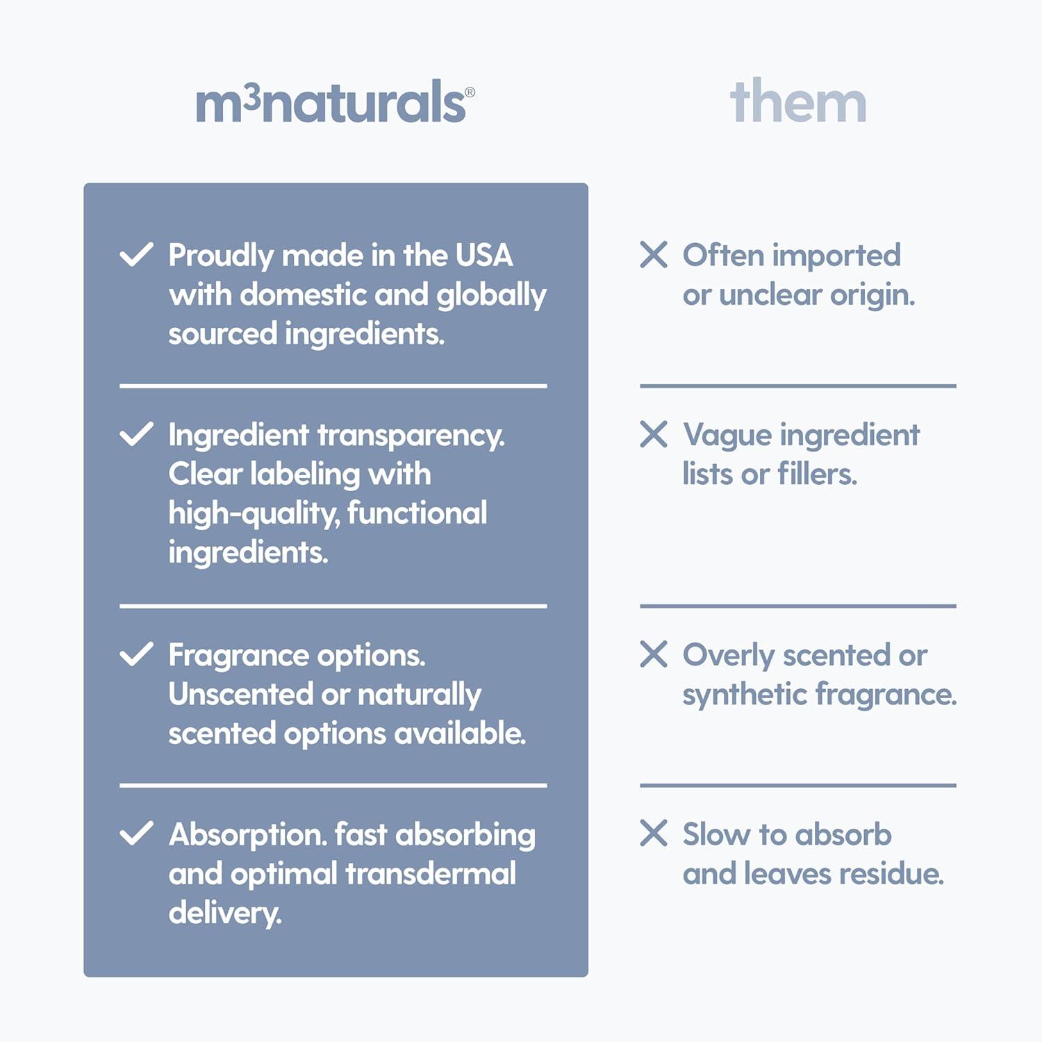 Skin-Loving Ingredients: Formulated with Magnesium, Hydrolyzed Collagen, Stem Cell Extract, Coconut Oil, and Shea Butter to support hydration, comfort, and overall skin wellness. Our organic magnesium lotion – magnesium glycinate lotion are made in USA with domestic and globally sourced ingredients. M3 Naturals is a brand that contains products that contain natural ingredients and other ingredients.